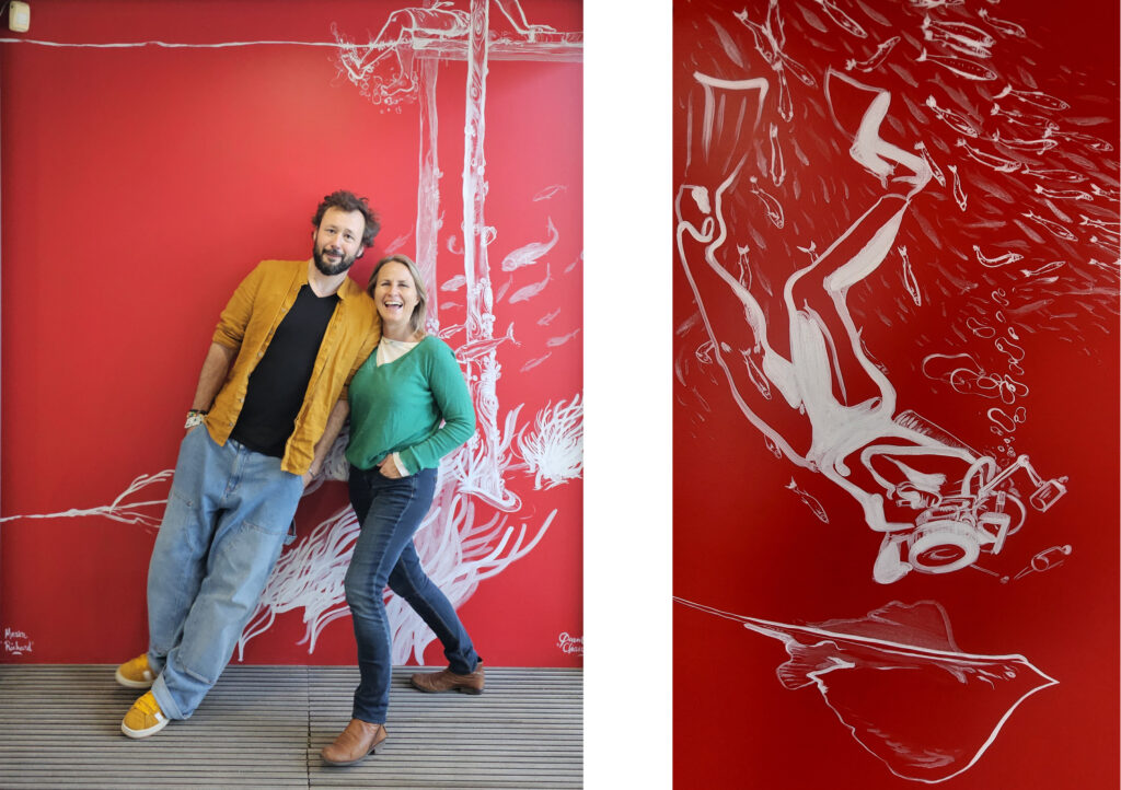 L’artiste Quentin Chaudat et la chercheuse Marion Richard (Ifremer/MARBEC) ont combiné leur force pour réaliser une exposition « Street-Art & Sciences » financée par l’ANR dans le cadre du PPR Océan et Climat, programme France 2030. Une première fresque a été réalisée en 2025 au sein de la station Ifremer Sète avec le Soutien de Maria Ruyssen. Avec la collaboration de Crystel Labasor, directrice du festival Street-Art « K-live », Quentin et Marion cherchent les prochains murs à peindre à Sète et sur le bassin de Thau pour 2026.