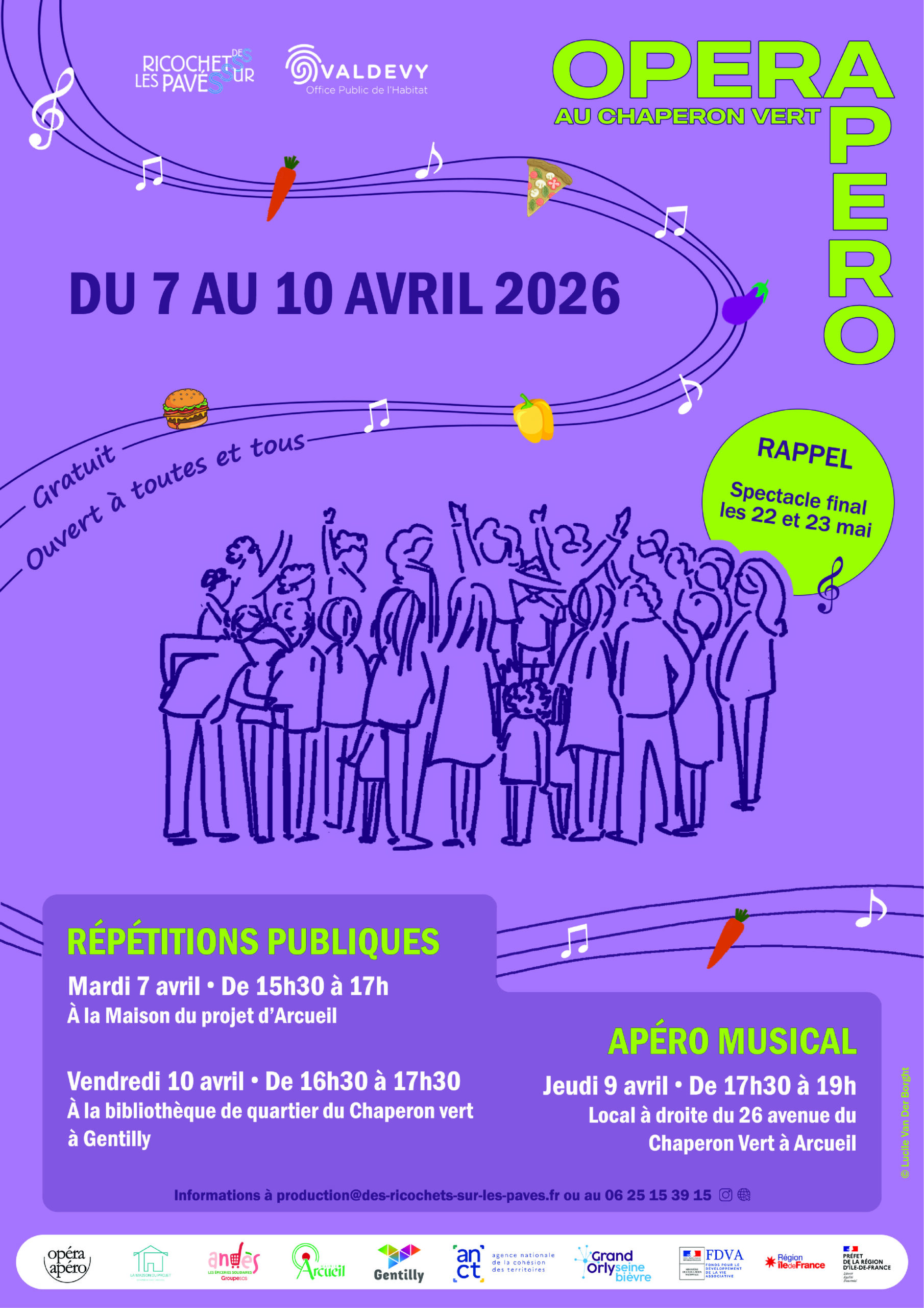 Arcueil/ GentillyParticipez au futur spectacle Opéra (mal)Bouffe et venez chanter entre ami·es, voisin·es, familles, petit·es et grand·es durant ce moment unique au coeur du Chaperon Vert ! Les 22 et 23 mai 2026, sur la place du marché (place Marcel Cachin) ! Au programme, des répétitions d'1h30 à la Maison du Projet : • le 28…