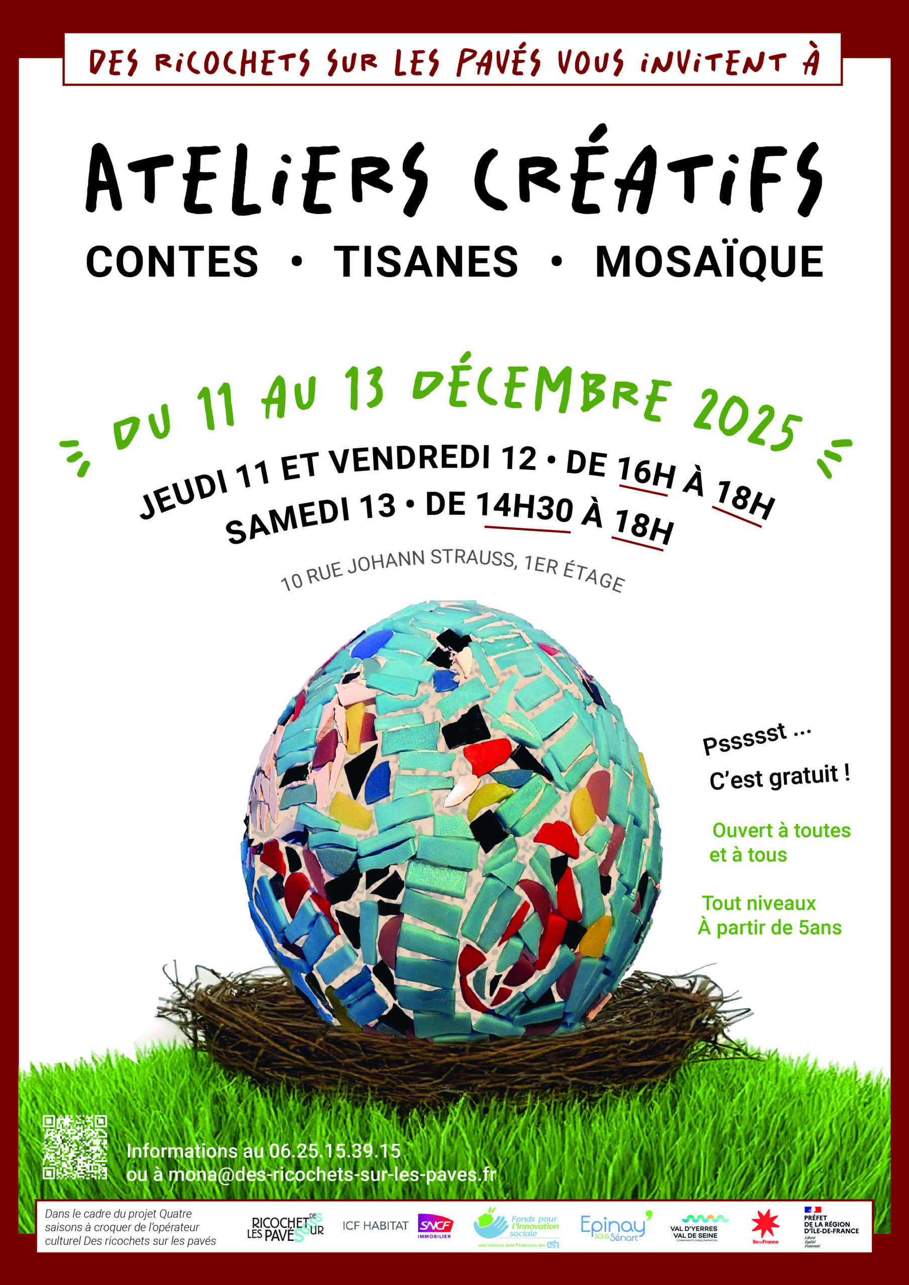 10 Rue Johann Strauss, Epinay-sous-Sénart, 1er étage 10 Rue Johann Strauss, Epinay-sous-Sénart, Essonne, FranceLes artistes de Quatre saisons à croquer sont de retour ! Vous êtes nombreuses et nombreux à vouloir un espace convivial en bas des immeubles. Alors, et si on imaginait ensemble cette «créature-sculpture» qui deviendra un espace de jeux et un support pour des moments partagés : ateliers, repas, projections en plein air... ATELIERS CONTES, TISANES,…