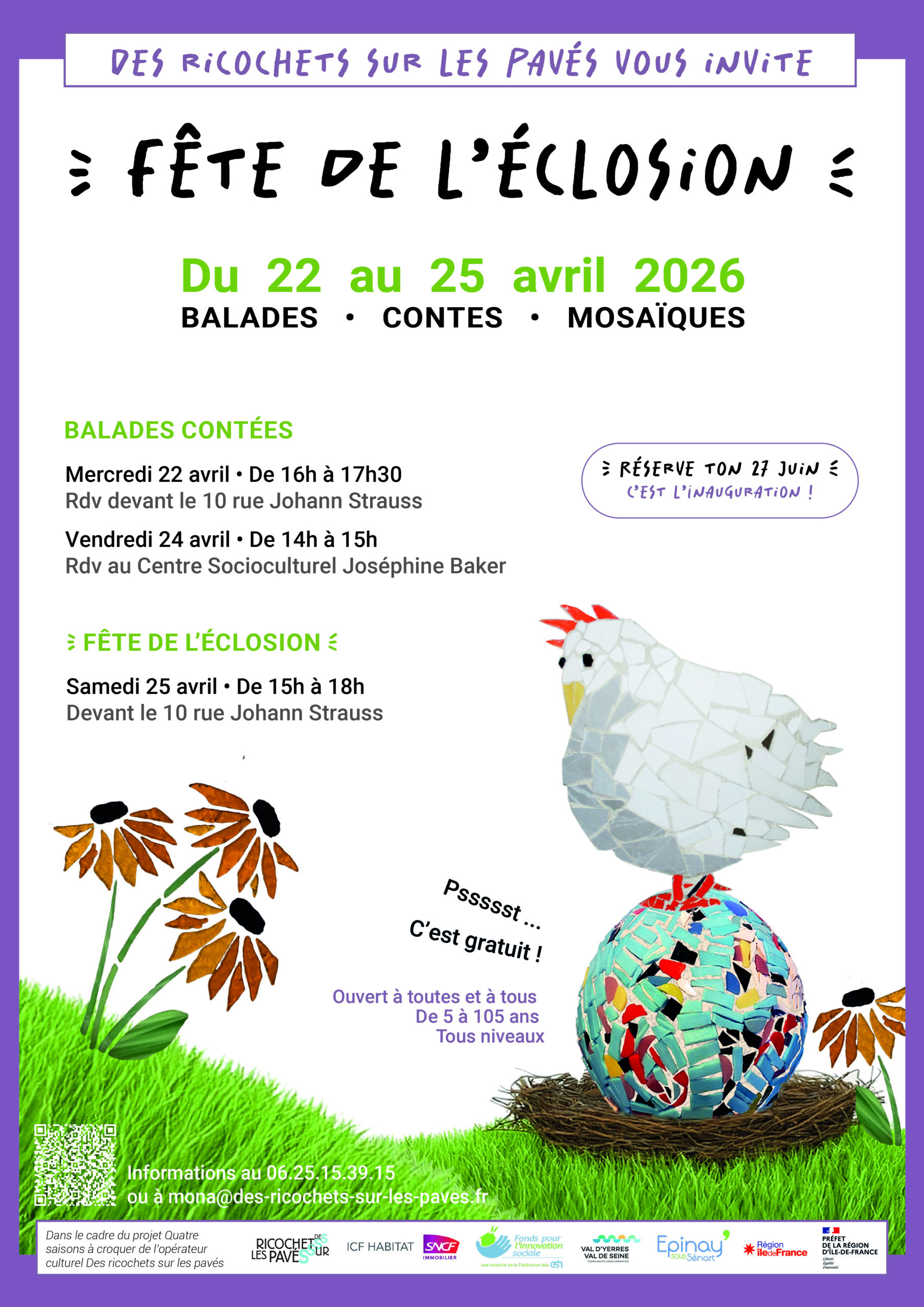 Les artistes Magali, Quentin et Irène sont de retour du 22 au 25 avril 2026 pour de nombreux ateliers de mosaïque, d’écriture, de contes mais surtout la fête de l’éclosion le samedi 25 avril 2026 !