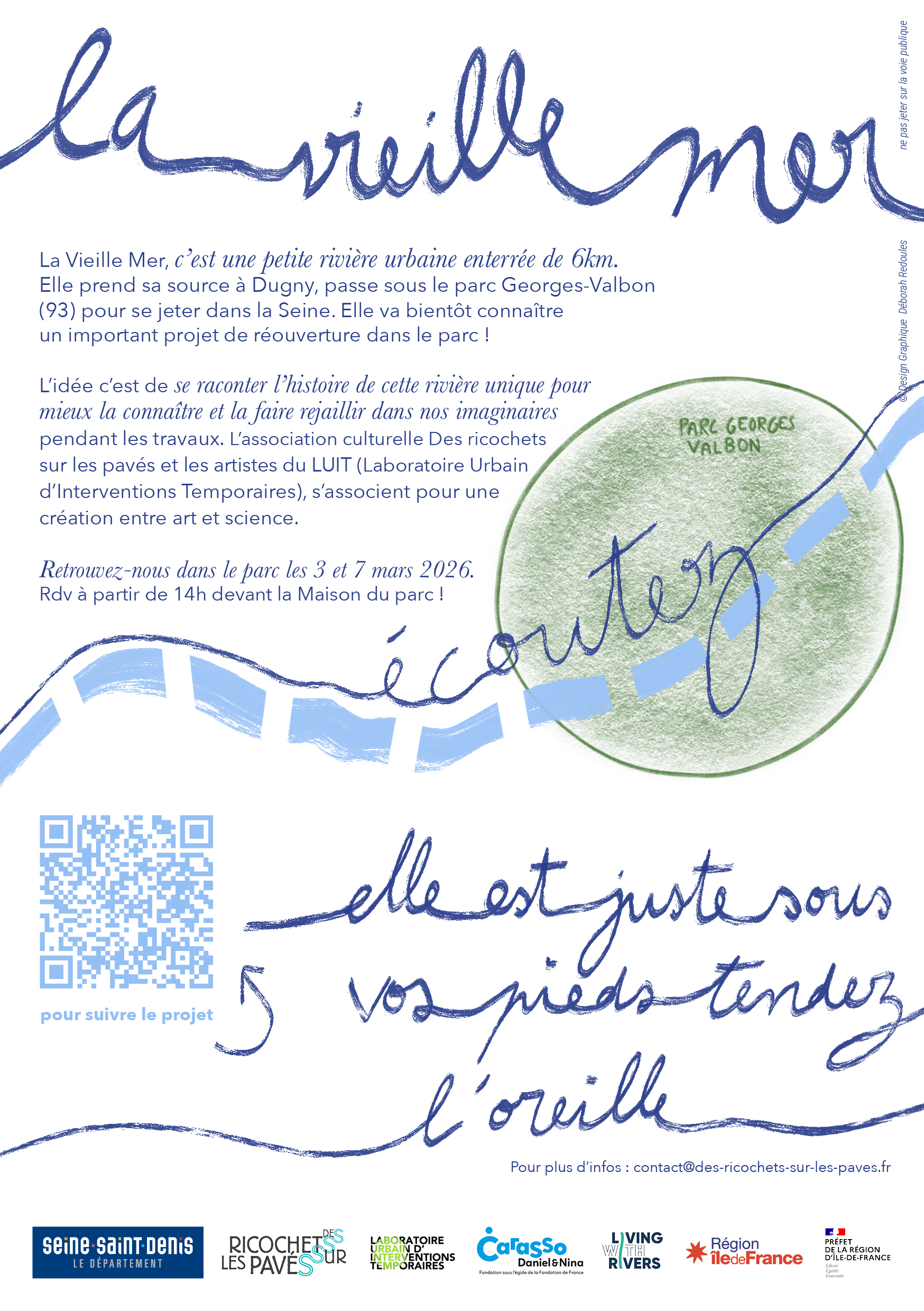 La Vieille Mer… C’est le nom de cette petite rivière souterraine qui passe juste sous nos pieds dans le parc Georges Valbon (93)… Elle est là, mais on ne la voit pas. Cette petite rivière urbaine va connaître un important projet de réouverture sur un tronçon de 3km. Le LUIT – Laboratoire Urbain d’Interventions Temporaires, mène un travail de mise en récit et de création sensible sur l’histoire et l’imaginaire de la Vieille Mer. Les artistes seront présent·es dans l’espace public pour de premières interventions et impromptus la semaine du 3 au 7 mars 2026.