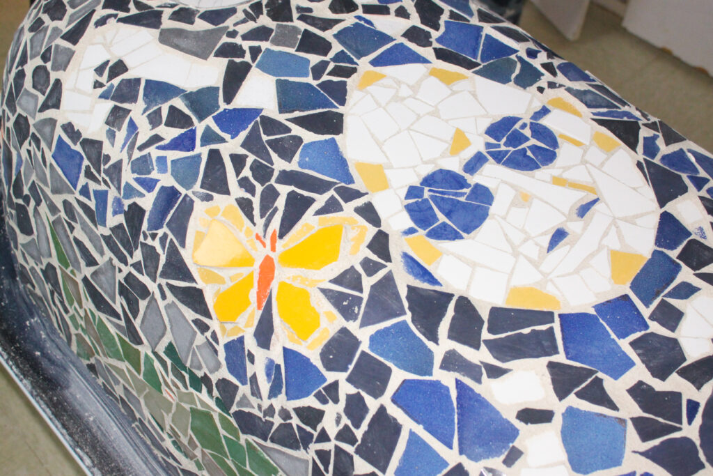 Créer de la mosaïque, compose des motifs avec du carrelage pour fabriquer le nid de la créature avec une ancienne baignoire !