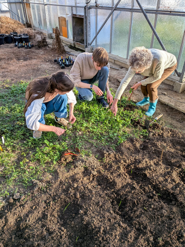 Repiquage du cirse des champs dans les anciennes serres de la ferme du Moulon de manière