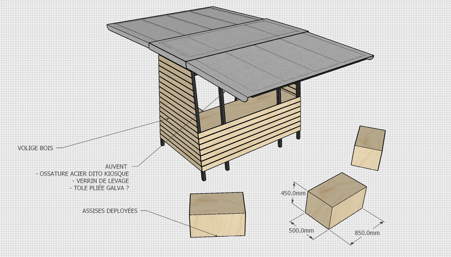 Au programme des envies :  des fêtes et des réunions de quartier, des scènes musicales, des ateliers ponctuels et des projections, des goûters et des banquets. Ce kiosque serait tout à la fois un support d’information, un lieu de stockage et le reflet de la vie locale et de sa créativité.